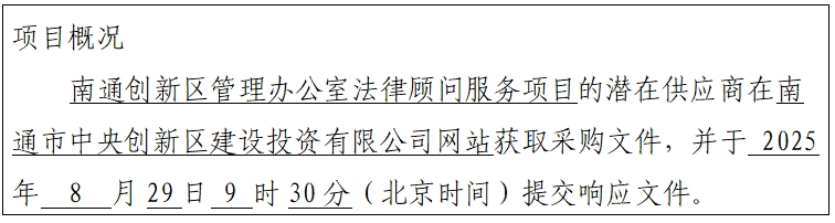 上海申邑工程咨詢有限公司受南通創(chuàng)新區(qū)管理辦公室(下稱采購人)委托,就南通創(chuàng)新區(qū)管理辦公室法律顧問服務(wù)項(xiàng)目實(shí)施競爭性磋商方式組織采購,現(xiàn)公告如下: